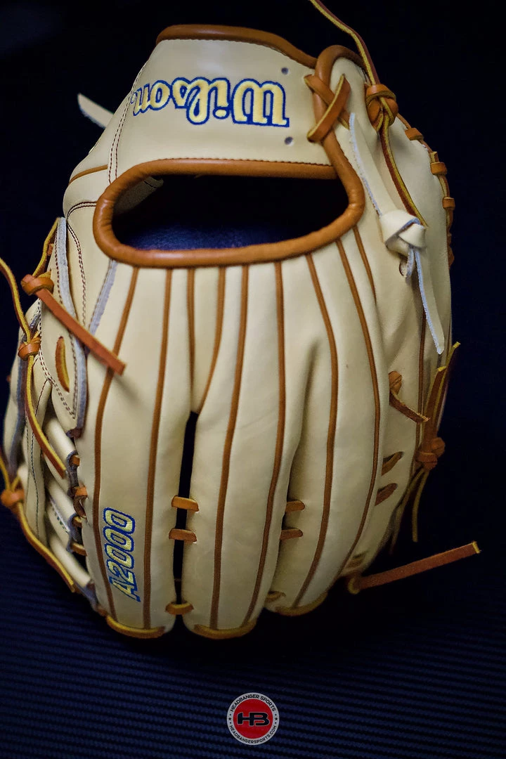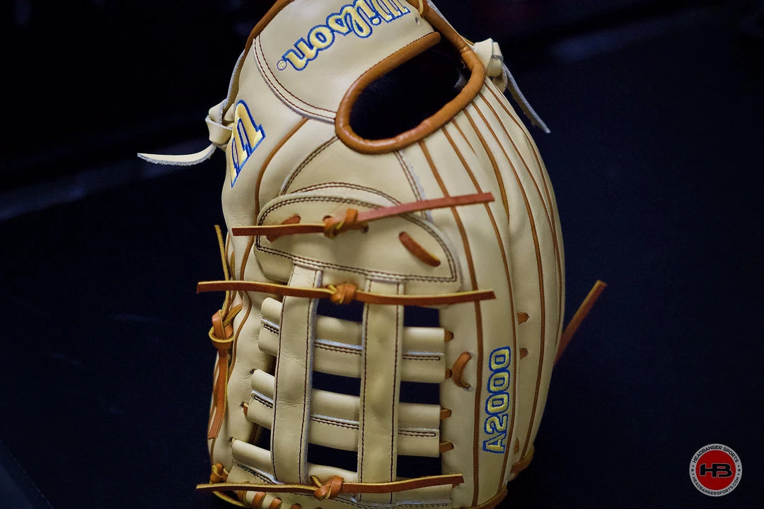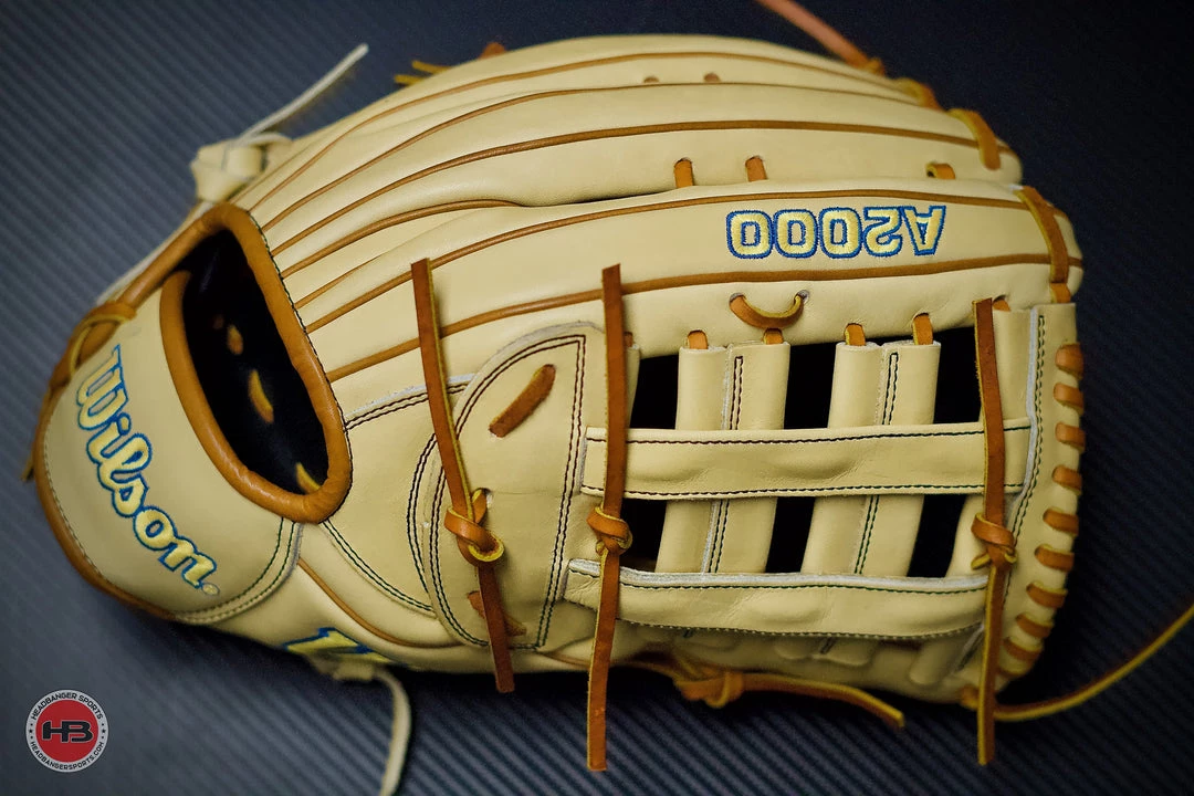 The durable Blonde Pro Stock® leather palm on this 13.5” pattern delivers a classic look, and the sturdy Dual Post Web is designed to corral hard-hit balls all over the field. With a little Blue Accenting on this gorgeous blonde vintage look is one not only for the field but any glove collectors wall!