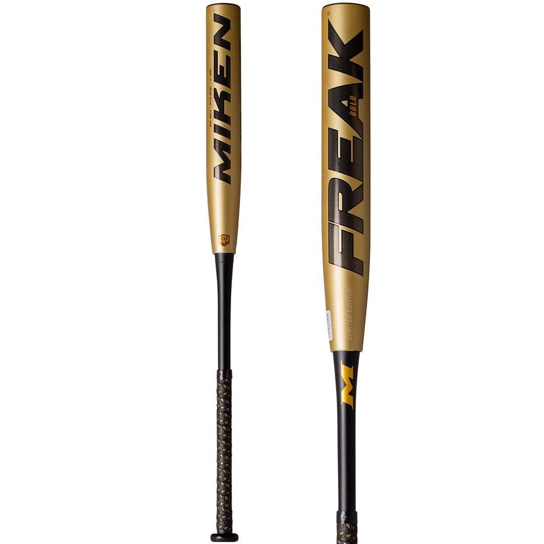 The 2022 Miken Freak Gold 12″ USA Slowpitch Softball bat offers the standard 2 1/4 inch barrel diameter, 12-inch barrel length, and is legal for play in all USA (Formerly ASA) sanctioned Leagues and Tournaments.Â
