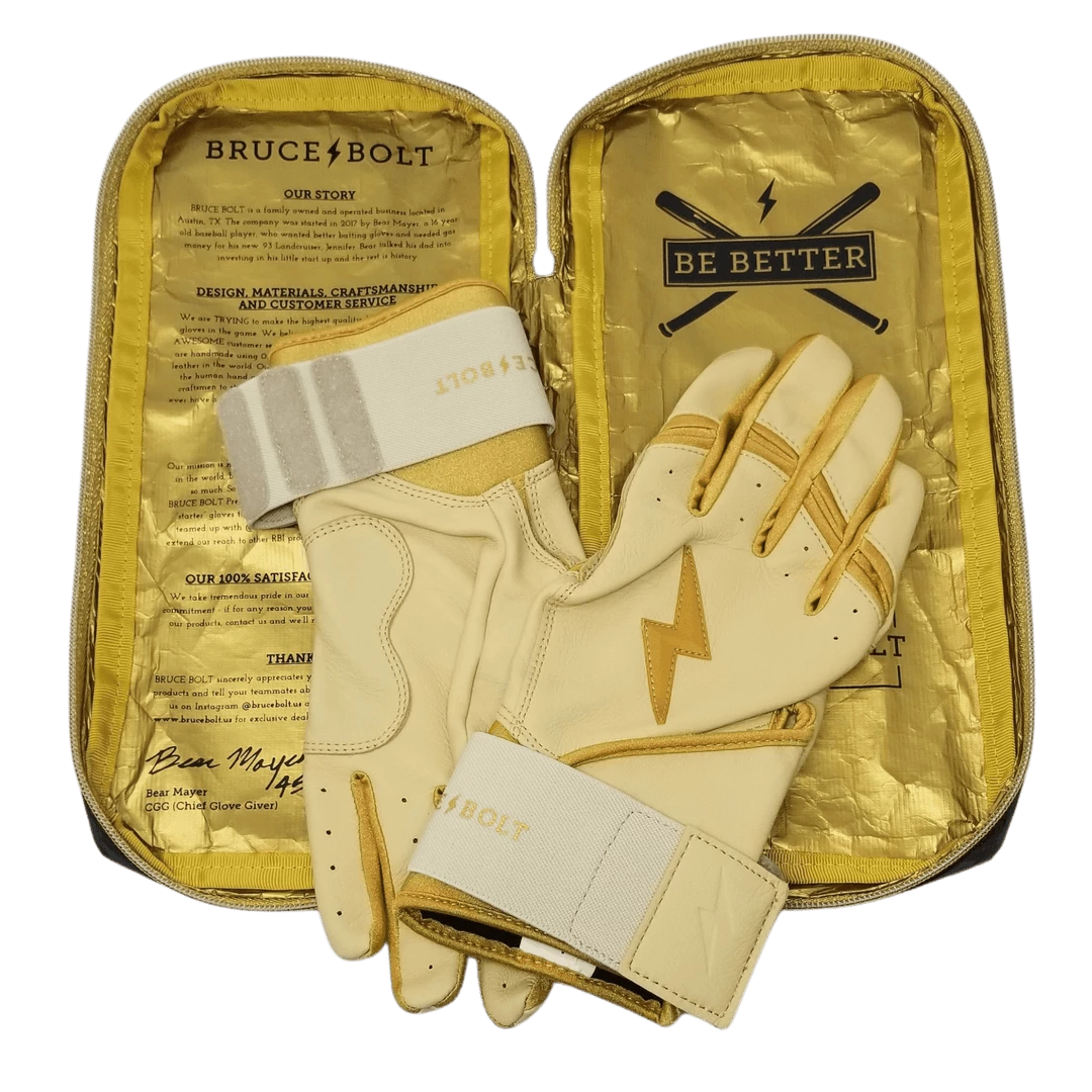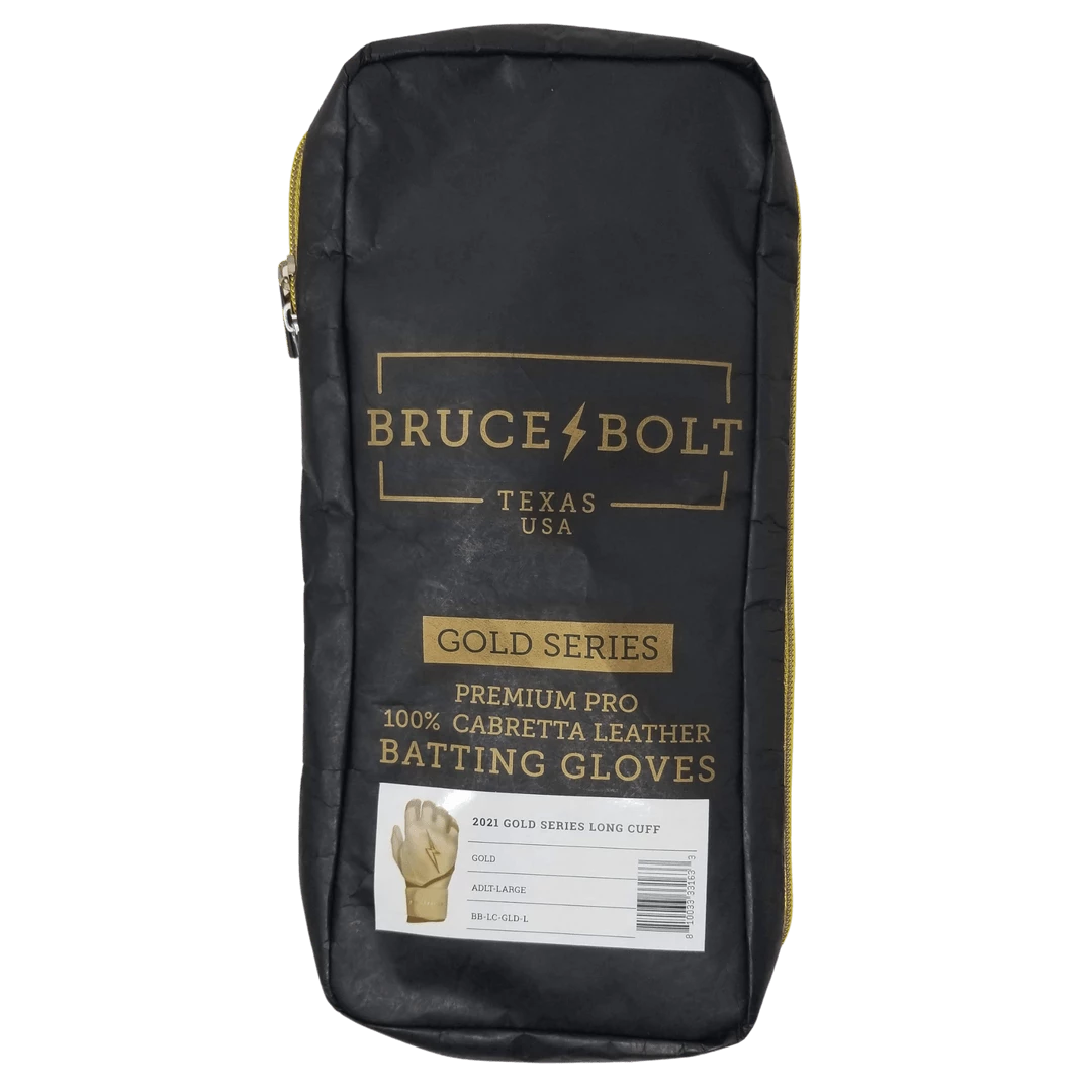 BRUCE BOLT is the newest name in baseball. Their batting gloves are some of the highest quality, best fitting, most durable gloves in the game. The GOLD SERIES Long Cuff gloves are made from ultra premium 100% 1.2mm Cabretta leather and are designed to fit the nuances of the human hand better. Each pair of BRUCE BOLT gloves are handmade by highly skilled craftsmen. It’s unlike any other glove out there.