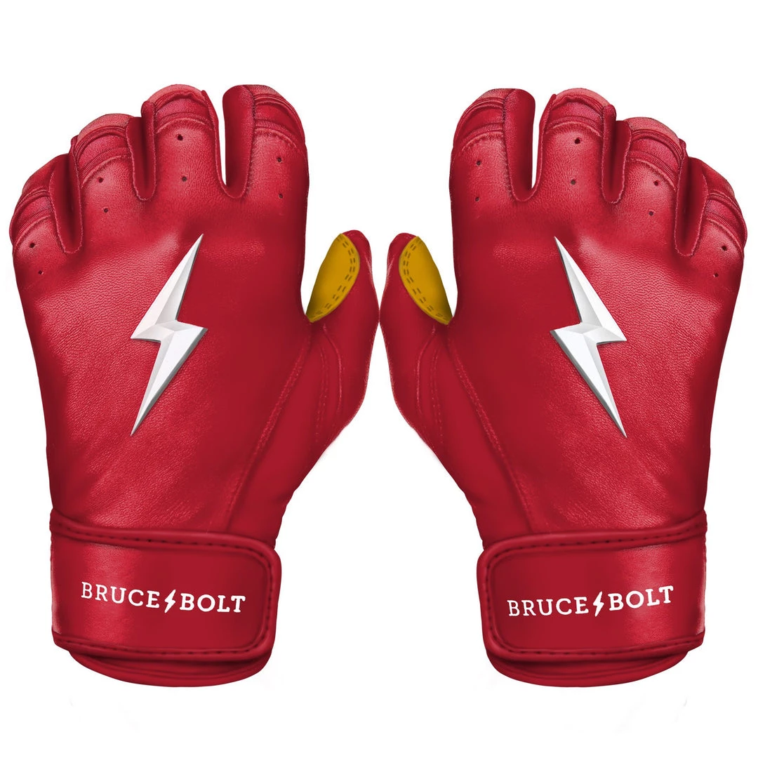 Each pair of BRUCE BOLT Red batting gloves are handmade by skilled craftsmen using only the highest quality 0.9mm Cabretta leather and stitching techniques which makes Bruce Bolt gloves buttery soft but more durable than any other glove on the market.
