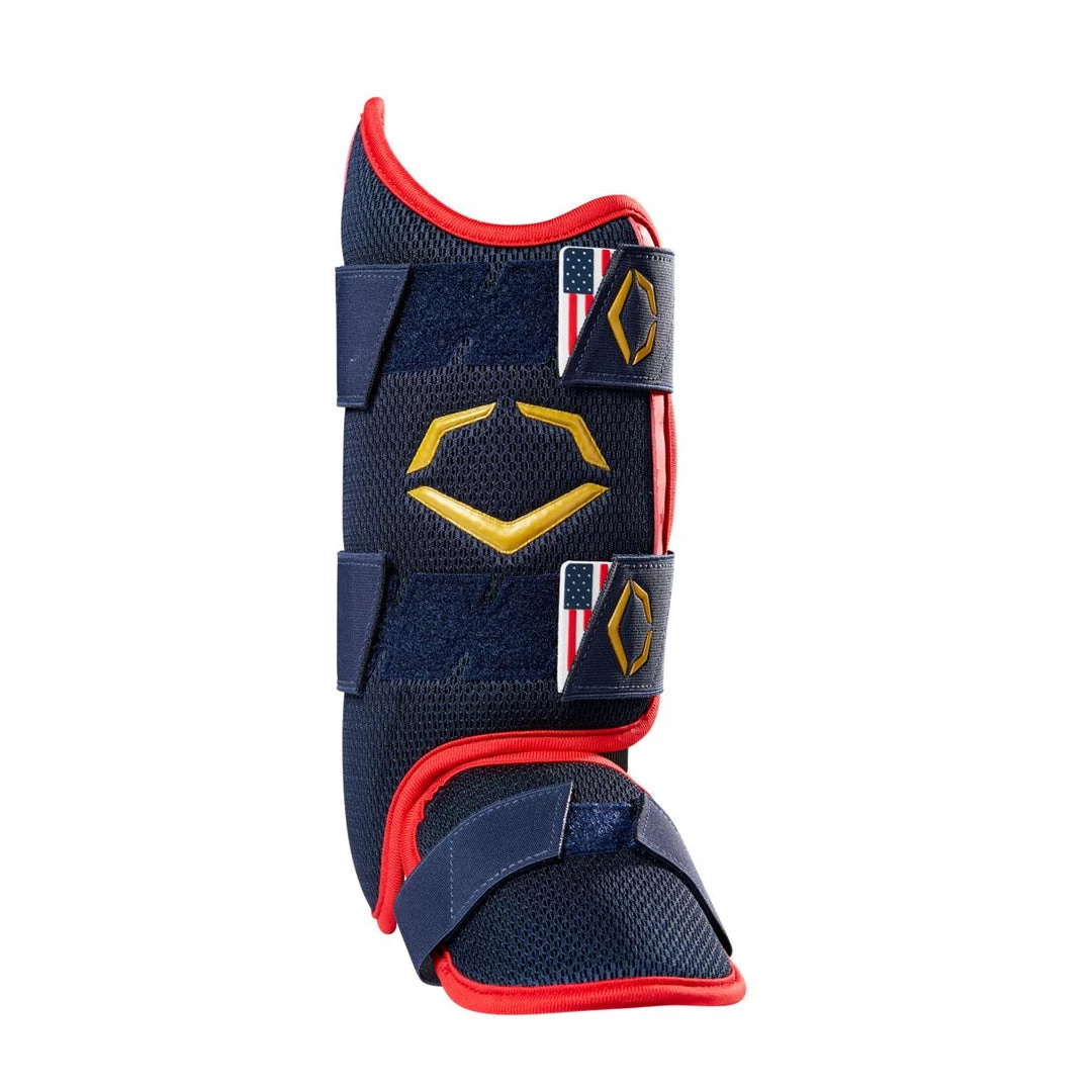 Stars, Stripes, and swagger. The USA Batter’s Leg Guard showcases a navy mesh material framed by red binding with stars embedded throughout and a metallic gold EvoShield logo. Exclusive red, white, and blue straps put the finishing touches on this eye-catching guard. The innovative design gives you an enhanced ergonomic guard shape that contours to your leg perfectly, providing lightweight, industry-leading protection.