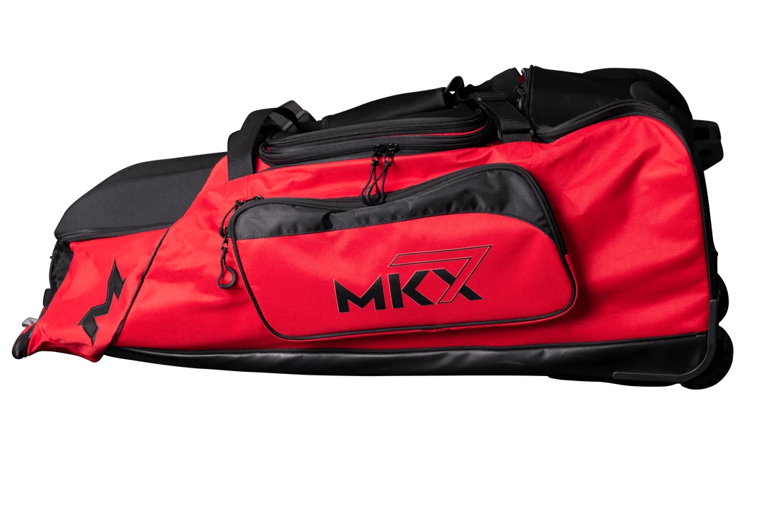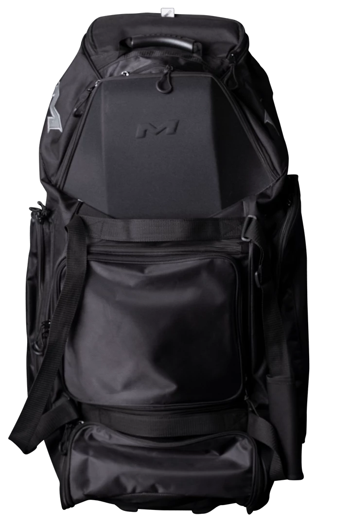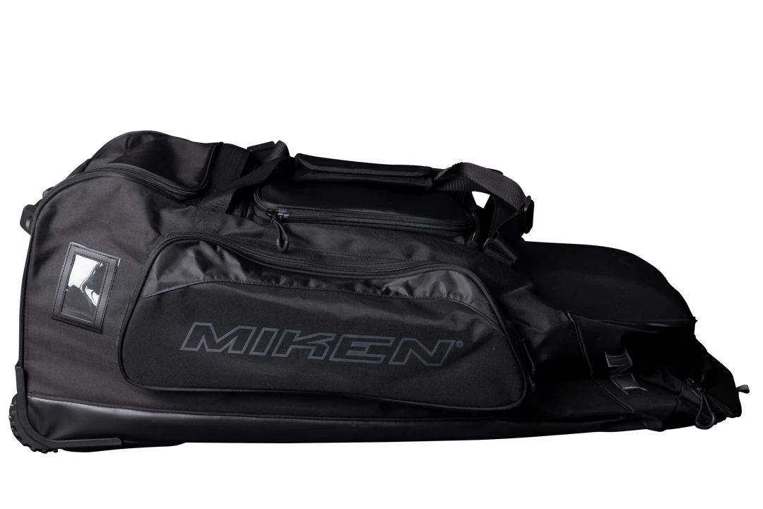 The all new Miken Championship Bag features a padded 4 individual bat compartment, a telescoping handle, Wide set tank wheels with full bottom rails and extra base support for strength, balance, and durability, a vented shoe compartment, extra large main compartment and 2 smaller compartments, molded top converts to a shelf, removable decoration panel for customization, easy grip handles, clear ID window and durable “J” style hook.