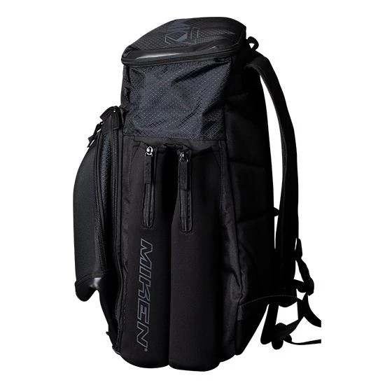 The all new Miken XL Backpack features: 4 zippered neoprene bat sleeves, a durable “J” style fence hook, 2 fleece lined pockets in top valet tray (for phone, accessories, etc), Glove storage, Molded front pocket that converts to shelf, Easy to clean tarpaulin bottom, and a Daisy chain for external batting glove storage.
