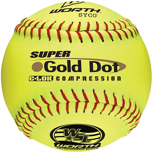 Worth WSL Super Gold Dot Slowpitch Softball YS44WSLC. Worth’s 12″ Slowpitch Softballs have Red stitching and are approved for play in the WSL sanctioned leagues and tournaments. These Worth’s Gold Dot softballs feature a 3-piece technology that has an inner layer that gives this softball consistent spin and durability, while also adding a Optic Yellow SYCO Composite Leather Cover for added durability.Â